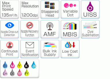 - Новые экологически безопасные и доступные сублимационные чернила Sb610 в конфигурация Bl/M/Y/K/LBl/Lm/Lk, дополненной уникальными флуоресцентными желтыми и розовыми чернилами для повышения яркости отпечатков и создания эффекта неонового свечения.